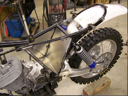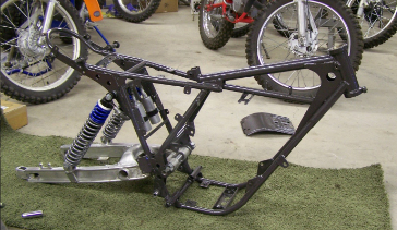 The finished, modified frame with the Yamaha 1988 Swingarm. Note the mounting of the shocks and the placement of remote rservoirs