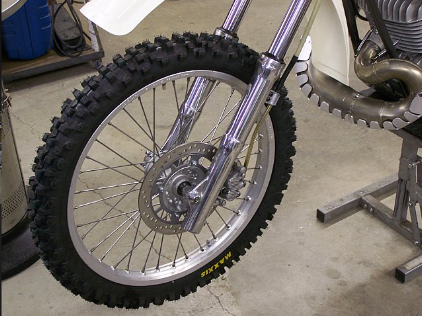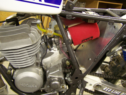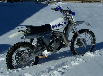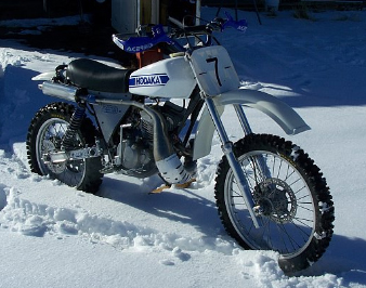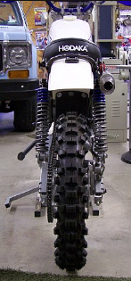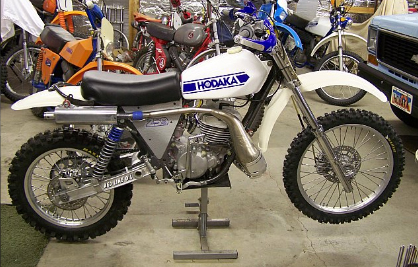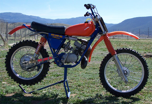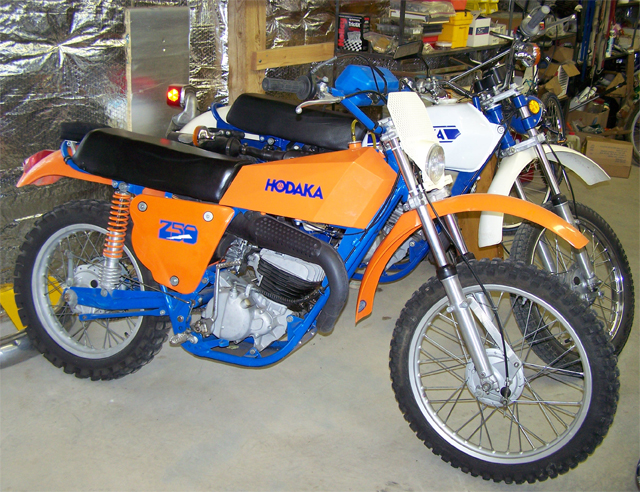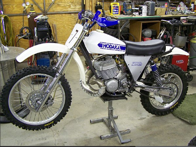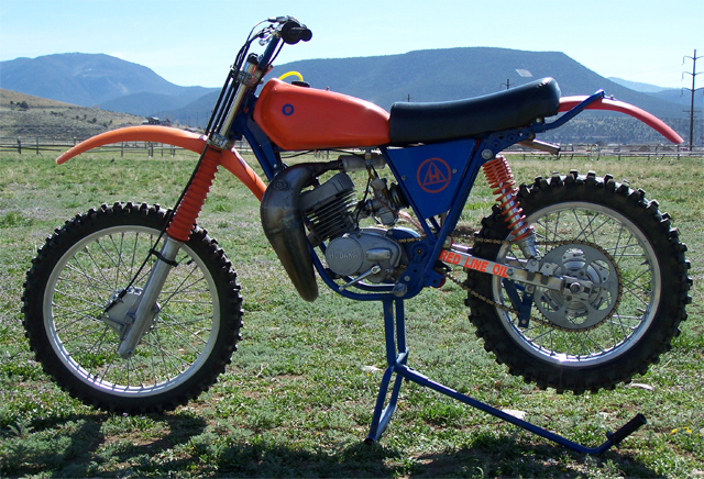 Utilizing a modified Hodaka 175 frame, reed valved 250 motor, a 1985 Honda front end with Disk Brake, a modified 1988 Yamaha YZ-250 swing arm, rear wheel and brake assembly. The FMF pipe from the 1988 YZ-250. The Maico shocks feature remote reservoirs.