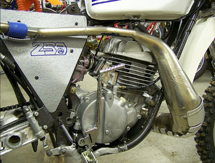 Engine in the Frame. Modified FMF Pipe from a 1988 YZ-250. Note the mounting tab for the rear brake master cylinder. Also note the modified Head of the engine.