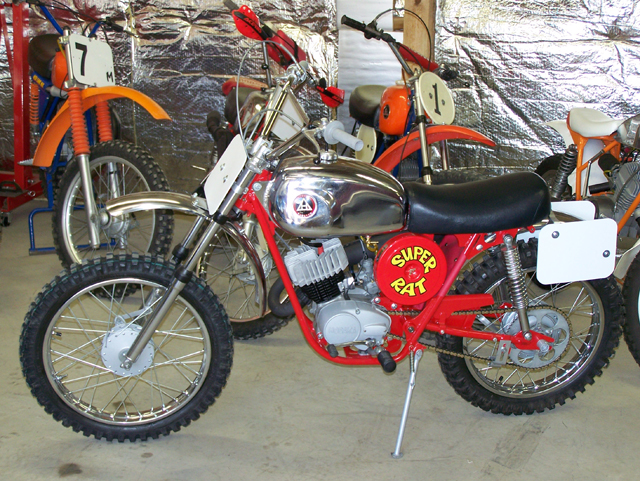 This is a 1970 Hodaka Super Rat. It has been fully restored by Rich Gagnon. It features a Van-Tech Leading Link front end, along with a Swenco Swingarm. Koni Shocks are mounted front and rear. It also sports a very rare, Webco 125cc big-bore kit on an early Rat bottom end which has been Ported, Reed-valved, with a 32-mm carb breathing through a Uni Filter. The pipe is an aftermarket of unknown origin that Rich had from the 70's. He modified it to fit this application and to work with the porting specs. David Matthew