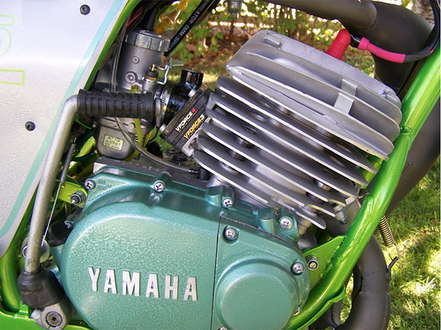 A close-up of the Webco 125cc big-bore kit on an early Super Rat bottom end. It has been Ported, Reed-valved, with induction via a 32-mm carb. The polished side cover is off and Ace90 motor.