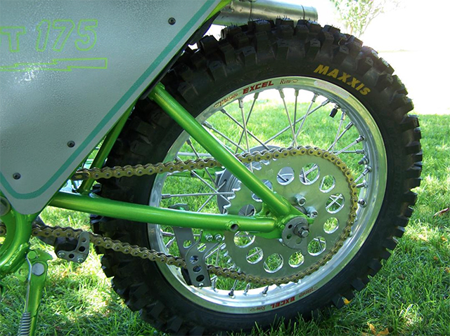 The RG-125 Features a low profile Clarke Tank, a very rare Swenco swing-arm, Kawasaki front forks and hub, Extensive porting work, topped off with a Harry Taylor pipe and a modified Mikuni Carb.